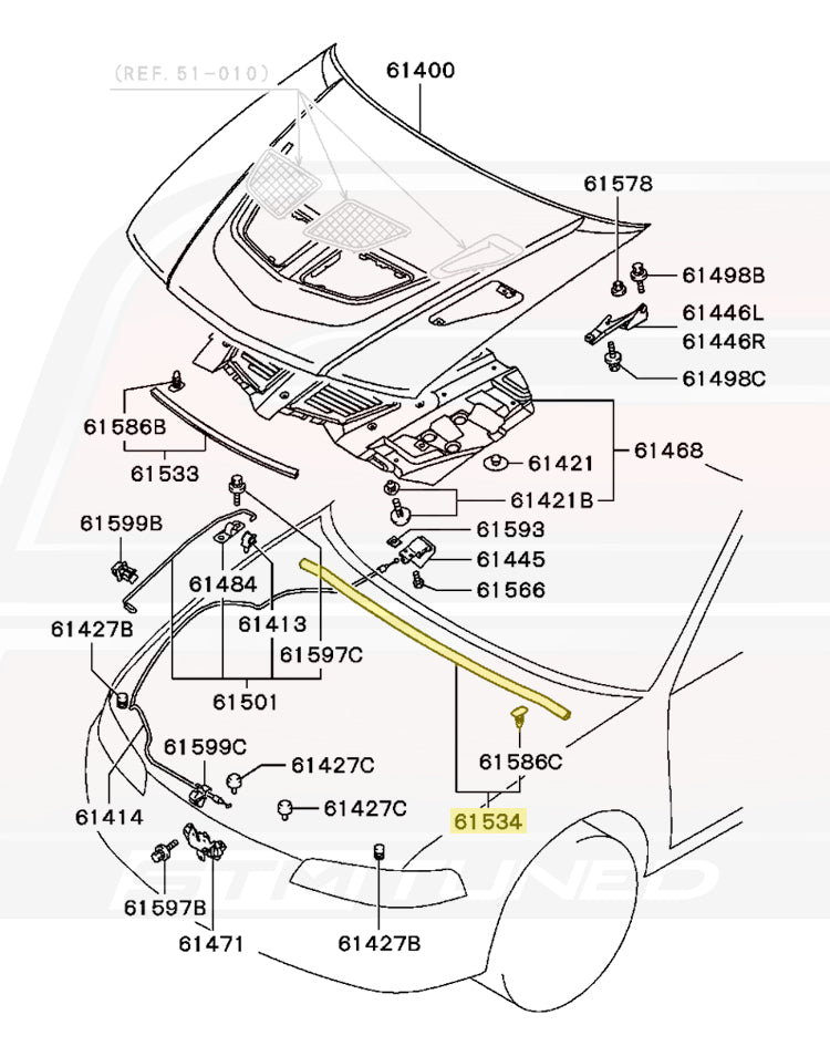 Genuine OEM Mitsubishi factory replacement under hood weather strip for JDM Evo 4/5/6 models. The Evo 5 diagram is pictured for reference. The white clips are included as pictured.