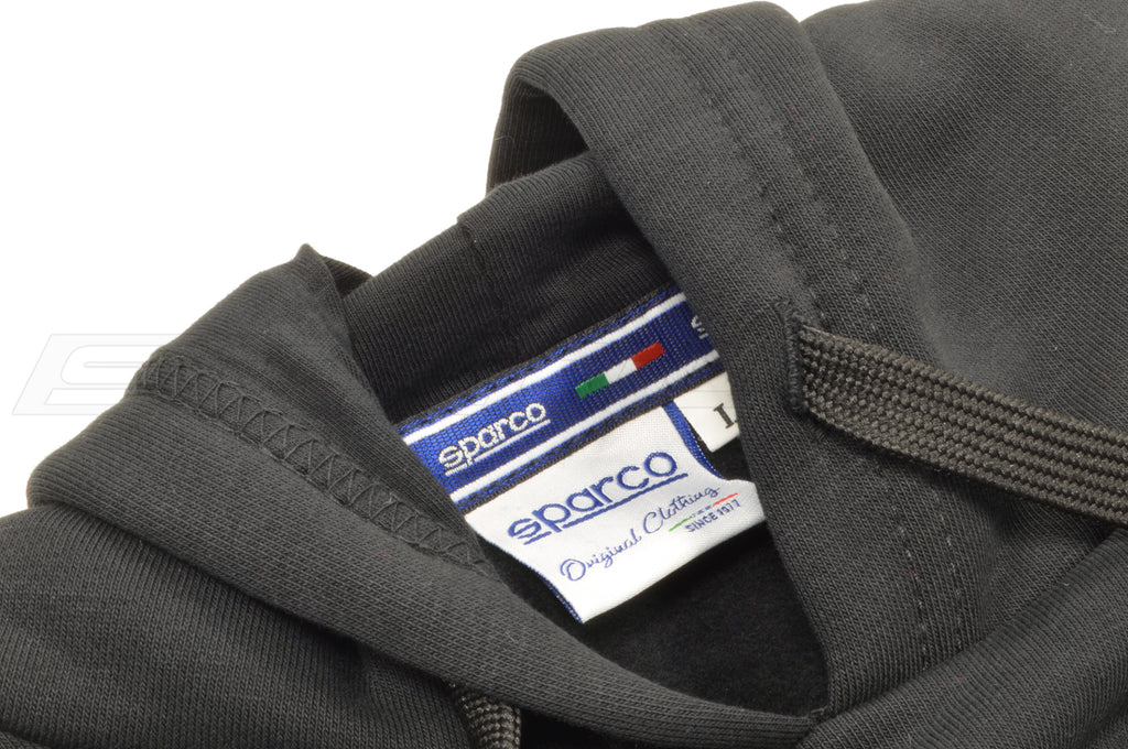 The Sparco Frame hoodie is made with a soft cotton/polyester blend material. The hoodie features a front graphic with a woven Sparco tag on the bottom of the hoodie. All hoodies are pre-shrunk. Made in Italy