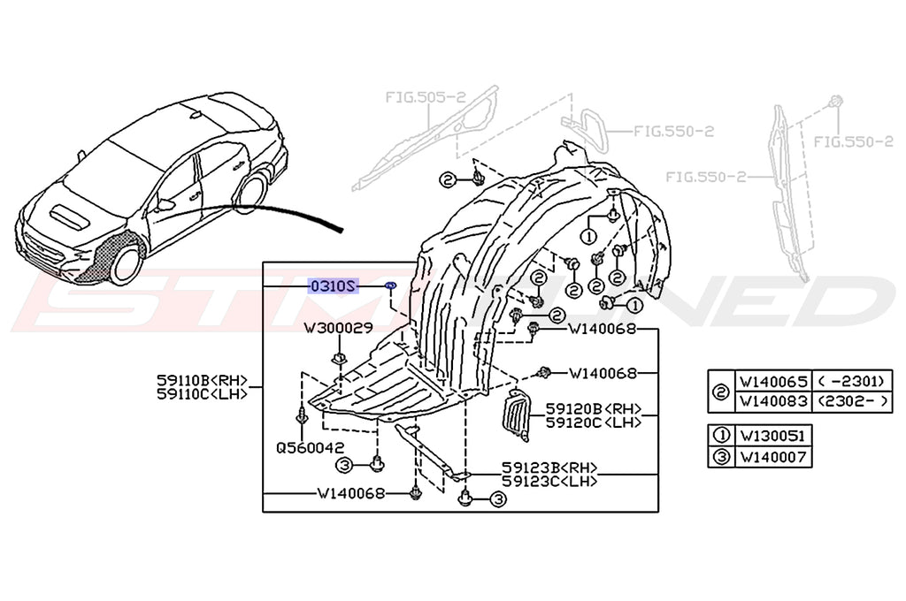 Genuine OEM Subaru factory replacement front fender liner washers for 2022+ VB WRX models. 2024 WRX diagram is pictured for reference. 4 are used in the diagram, 2 for each side. Sold individually as needed, price is for one washer.