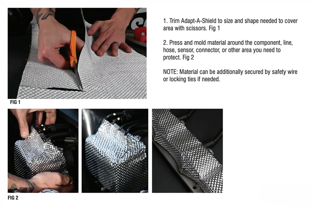Adapt-A-Shield XT is a formable, flexible, extreme heat barrier to reflect engine and exhaust heat from components and protect against abrasion. It easily conforms to odd shapes and can be cut with scissors or a utility knife. Fasten it where needed with straps or DEI stainless steel ties for a professional finish.