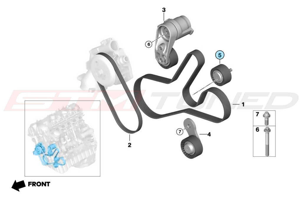 Genuine OEM BMW factory replacement idler pulley for F8X M2/M3/M4 models. Also called a deflection pulley.