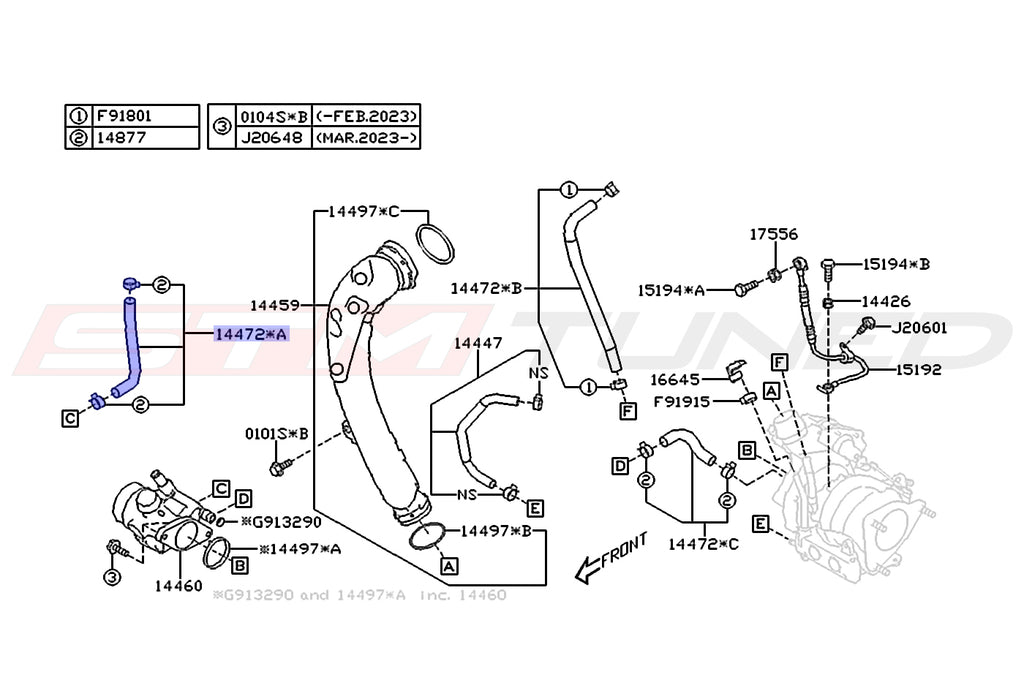 Genuine OEM Subaru factory replacement turbo inlet coolant/water line for 2023-2024 WRX. New clamps are included. The 2024 WRX diagram is pictured for reference. STM will update with new pics soon!