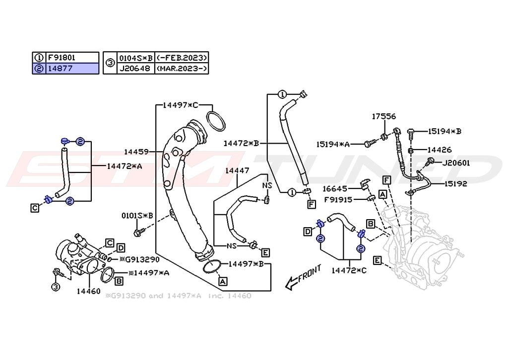 Genuine OEM Subaru factory replacement hose clamps for the 2022+ WRX turbo coolant/water lines. 2024 WRX diagram is pictured for reference. 4 clamps are used in the highlighted diagram. Sold individually as needed, price is for one clamp. STM will update with new pics soon!