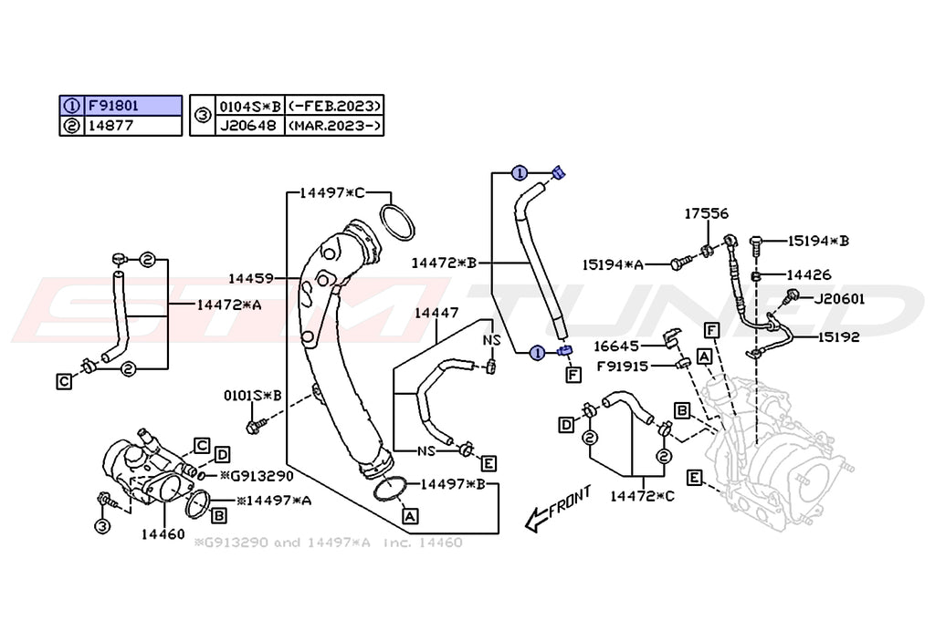 Genuine OEM Subaru factory replacement hose clamps for the 2022+ WRX turbo coolant/water line. 2024 WRX diagram is pictured for reference. 2 clamps are used in the highlighted diagram. Sold individually as needed, price is for one clamp. STM will update with new pics soon!