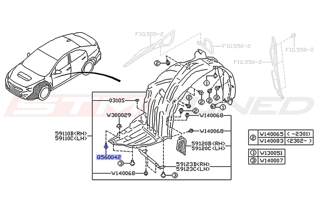 Genuine OEM Subaru factory replacement front fender liner screws for 2022+ VB WRX models. 2024 WRX diagram is pictured for reference. 2 are used in the diagram, 1 for each side. Sold individually as needed, price is for one screw.