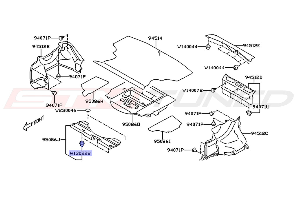 Genuine OEM Subaru trunk panel clips for 2022+ VB WRX. The 2024 WRX diagram is pictured for reference. 3 of these white clips are used in the back trunk panel closest to the seats. Sold individually as needed, price is for one clip.