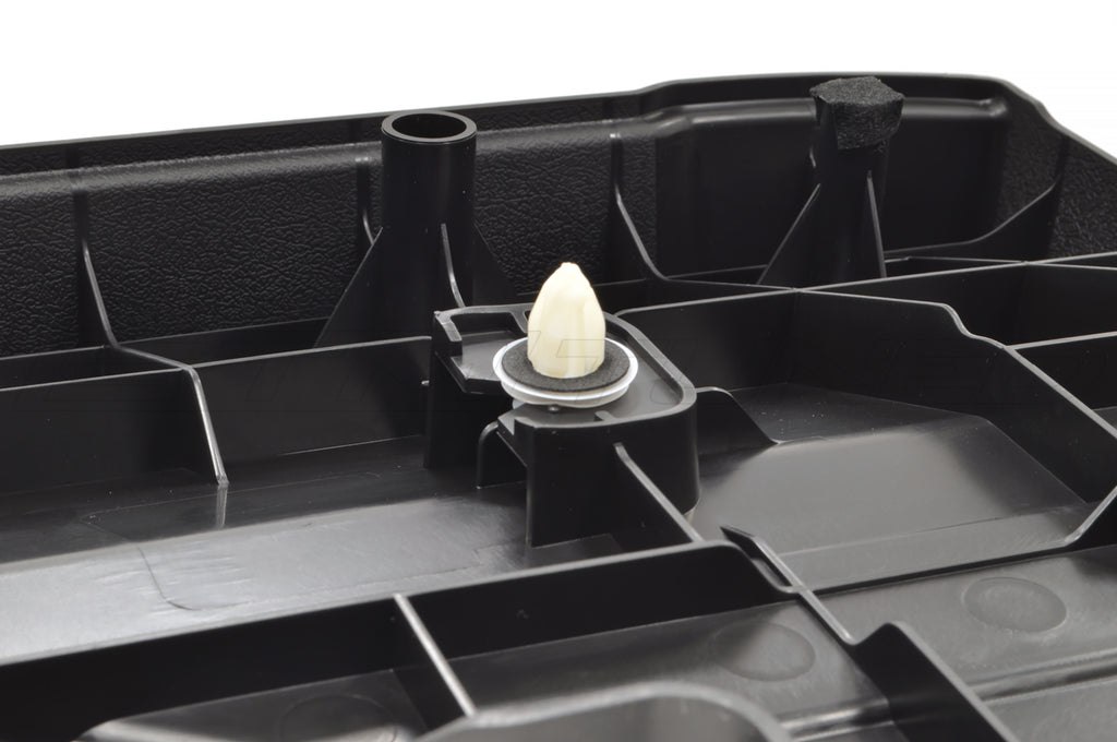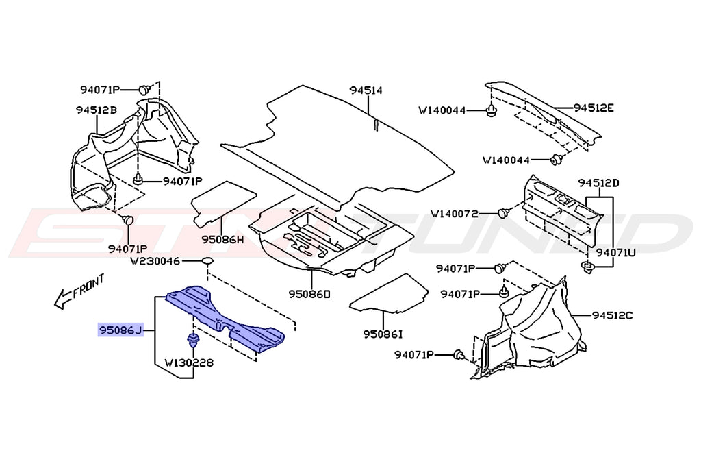 Genuine OEM Subaru trunk floor spacer for 2022+ VB WRX. The 2024 WRX diagram is pictured for reference. This large black plastic panel sits in the back of the trunk floor closest to the seats. It includes the 3 white clips on the back side and the 4 replacement black push clips are linked below.