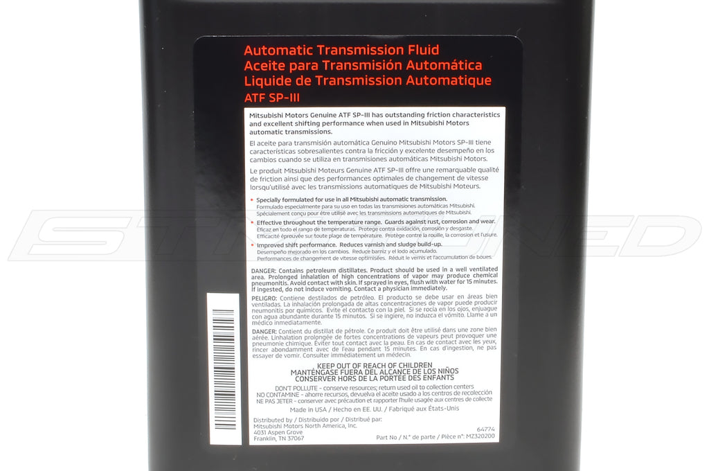 Genuine OEM Mitsubishi SP III automatic transmission fluid. This ATF is recommended for the 1G/2G DSM automatic transmissions as well as the Evo 8/9 ACD pump, the Evo X AYC and Evo 4/5/6 AYC. Sold per quart, please adjust quantity as needed.