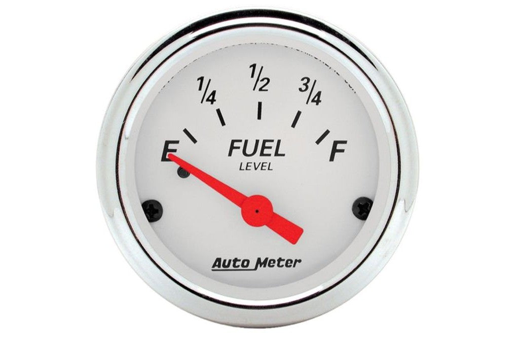 AutoMeter 2-1/16" air-core fuel level gauge with 0-90 ohm range, incandescent lighting, and highly polished chrome bezel. Compatible with most 1965-1997 Chevrolet/GM fuel senders.
