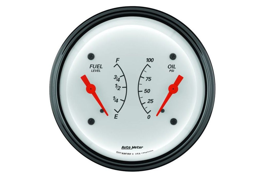 AutoMeter 3-3/8" Arctic White Dual Gauge, Oil pressure, Fuel Level, 100 PSI/0-90 Ω (1324)