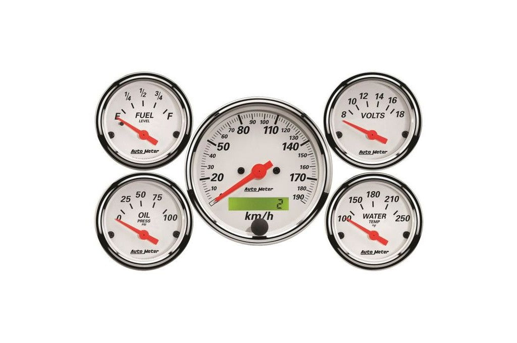 AutoMeter 5-piece gauge kit with 3-1/8" and 2-1/16" gauges featuring electric speedometer (KM/H), water temperature, oil pressure, fuel level, and voltmeter with incandescent lighting and all necessary senders included.