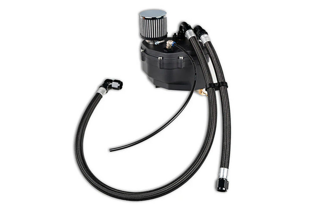Our sleek cast design replaces your plastic coolant overflow tank and doubles as your coolant overflow tank and catch can, all with an easy single bolt install.