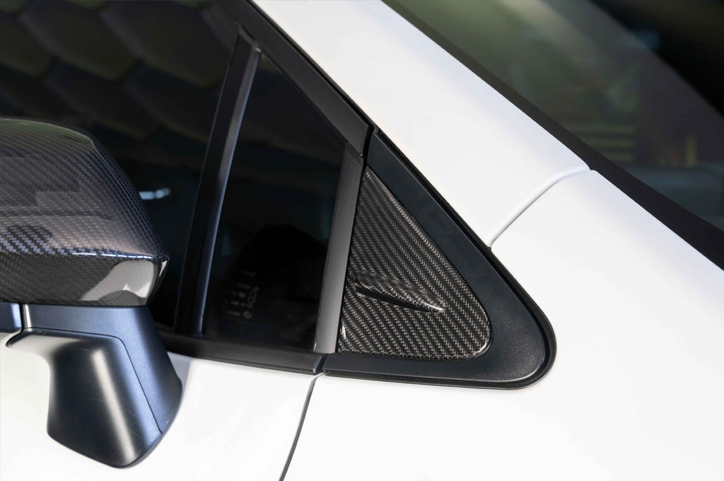 Rexpeed dry carbon fiber wind deflector covers for 2023+ GR Corolla install directly over your factory pieces with paper-thin 3M adhesive. Standard 2x2 carbon weave with a gloss finish.