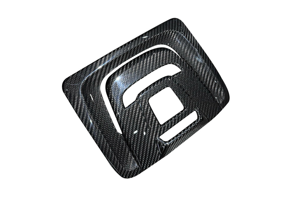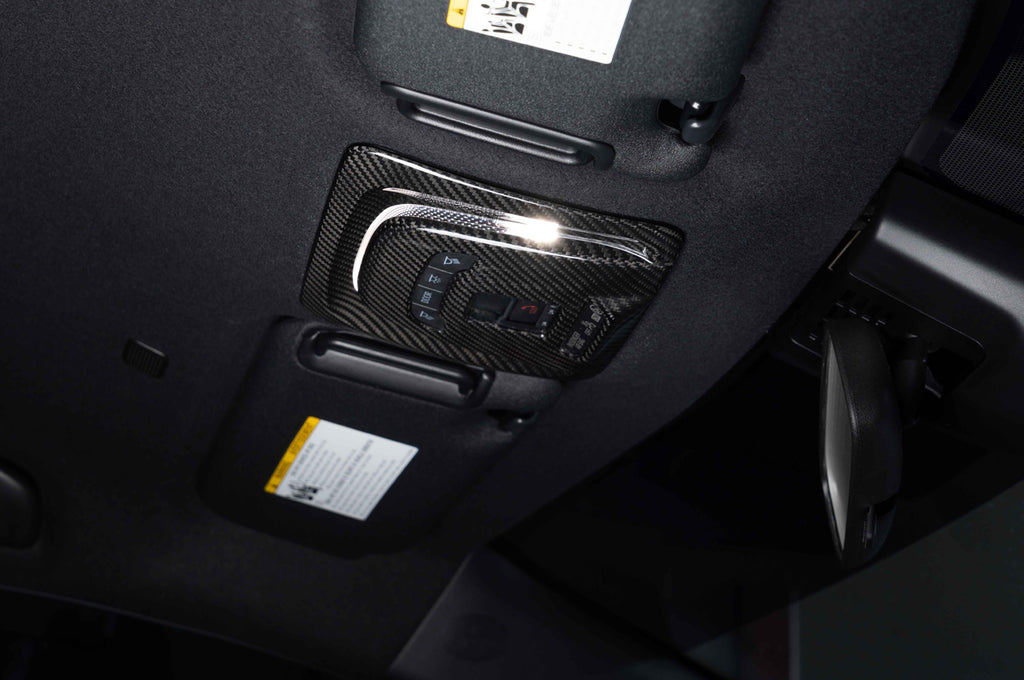 Rexpeed dry carbon fiber overhead reading/map light cover for 2023+ GR Corolla install directly over your factory piece with paper-thin 3M adhesive. Standard 2x2 carbon weave with a gloss finish.
