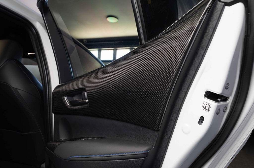 Rexpeed dry carbon fiber interior door trim covers for 2023+ GR Corolla install directly over your factory trim with paper-thin 3M adhesive. These are the larger panels for all 4 doors. Standard 2x2 carbon weave with a gloss finish.