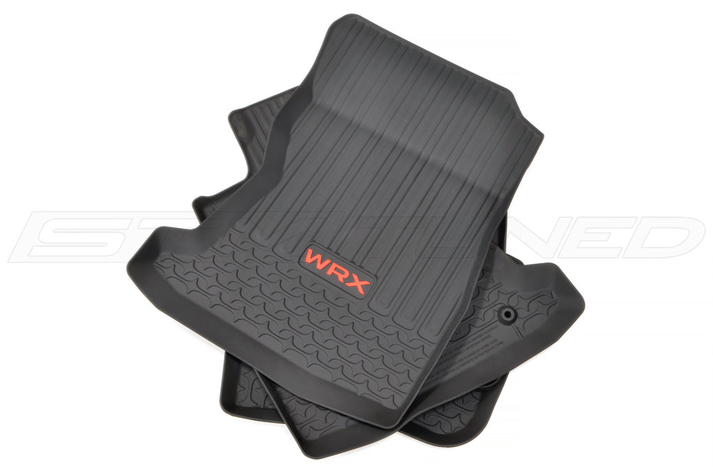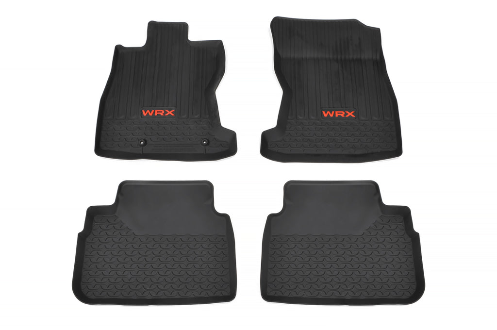 Genuine OEM Subaru all weather floor mats for the 2022+ WRX. These heavy duty rubber mats have the red WRX logo on both front mats. Includes the full set of 4 mats.