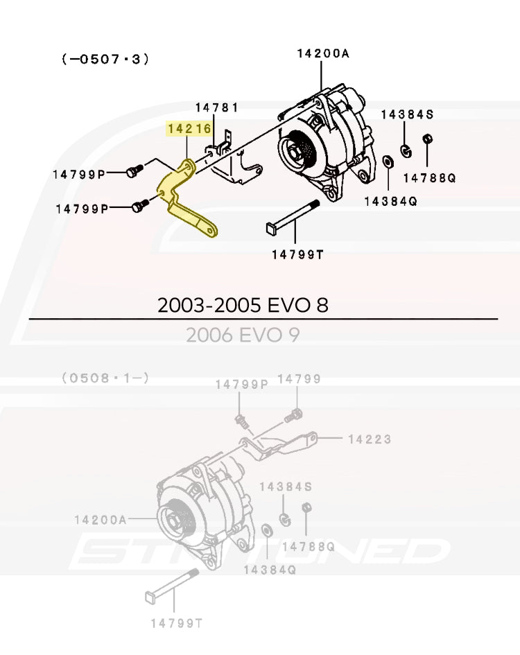 Genuine OEM Mitsubishi factory replacement alternator bracket for the 2003-2005 Evo 8. See diagram for placement. This does not fit Evo 7 or 9 models.