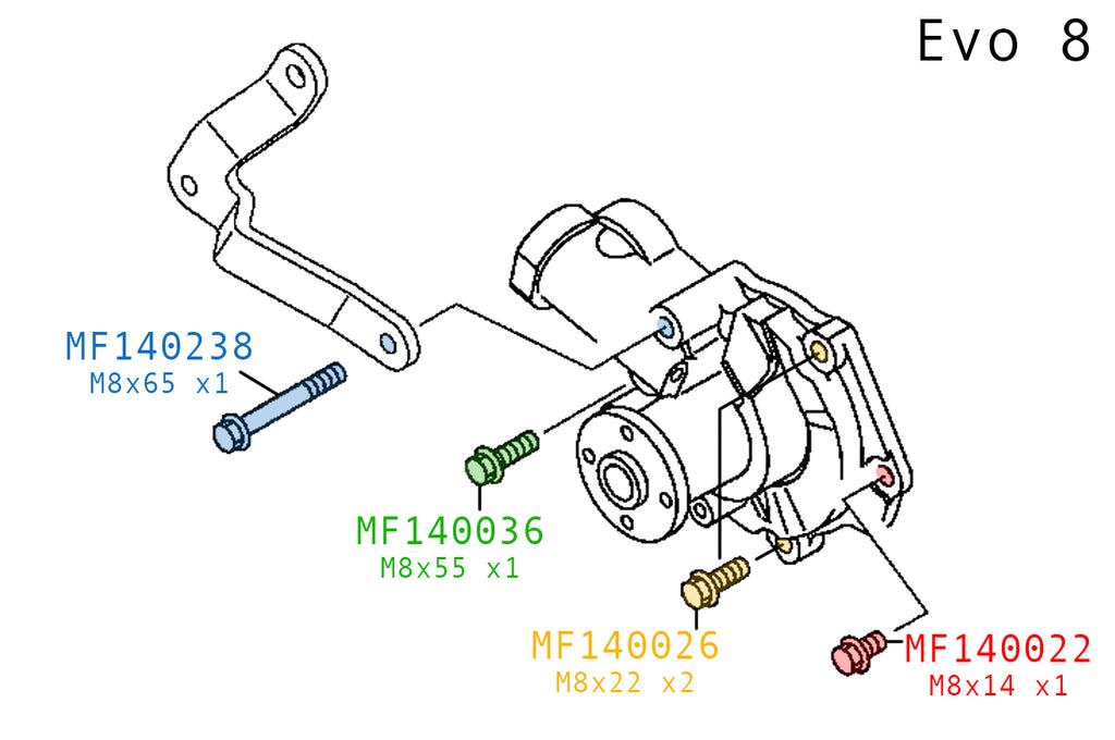 Genuine OEM Mitsubishi factory replacement bolts for the Evo 8 water pump. Each bolt is sold individually as needed. Please double check all quantities.