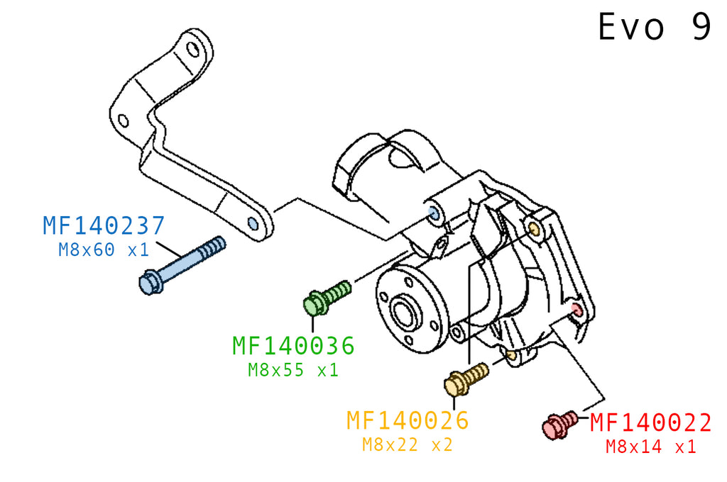 Genuine OEM Mitsubishi factory replacement bolts for the Evo 9 water pump. Each bolt is sold individually as needed. Please double check all quantities.