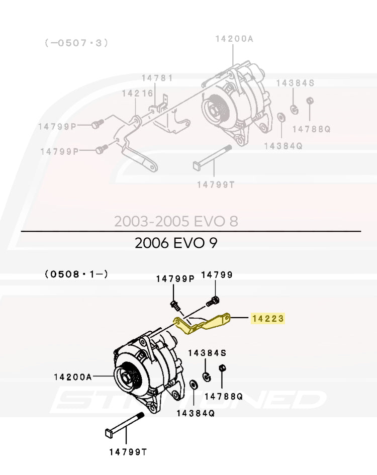 Genuine OEM Mitsubishi factory replacement alternator bracket for the 2006 Evo 9. See diagram for placement. This does not fit Evo 7 or 8 models.