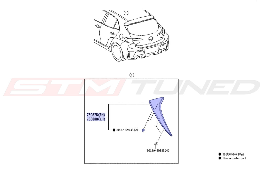 Genuine OEM Toyota factory replacement rear hatch side spoilers for GR Corolla. These are the shiny black pieces that are under the spoiler on either side of the rear window. Left and right sides are sold separately as needed. Price is for one cover.