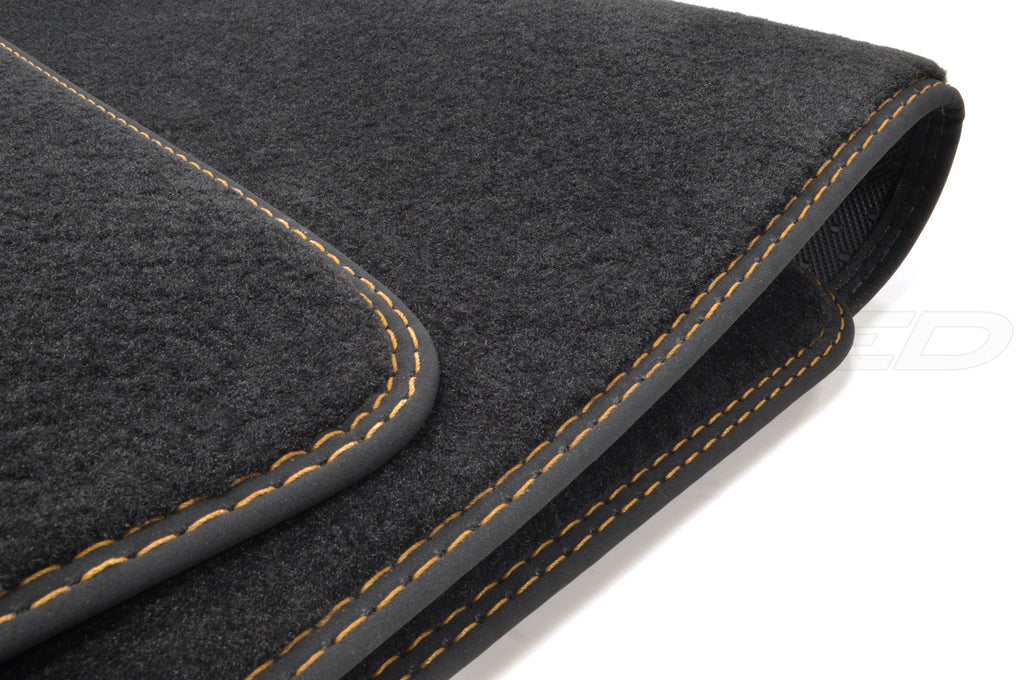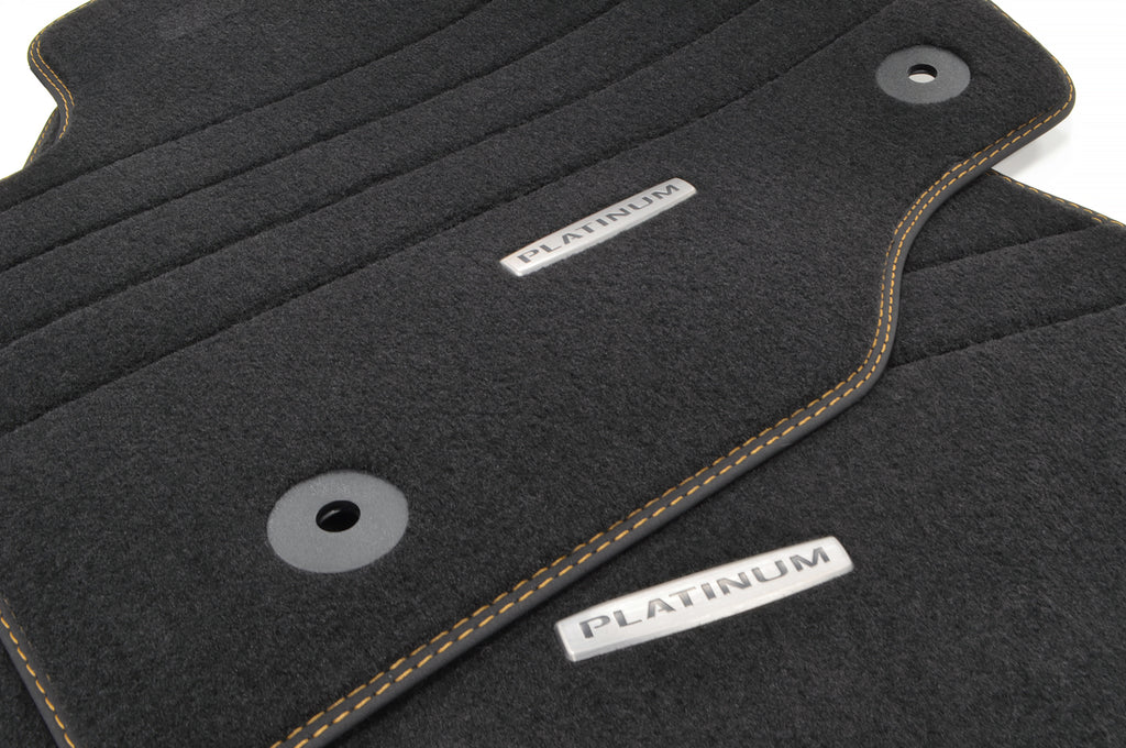 Genuine OEM Ford factory replacement Platinum carpeted contour floor mats for 2018+ Super Duty truck models. Includes the set of 3 mats for driver, passenger and rear seat. These have the metal Platinum badge on the front mats and tan/brown/orange stitching.