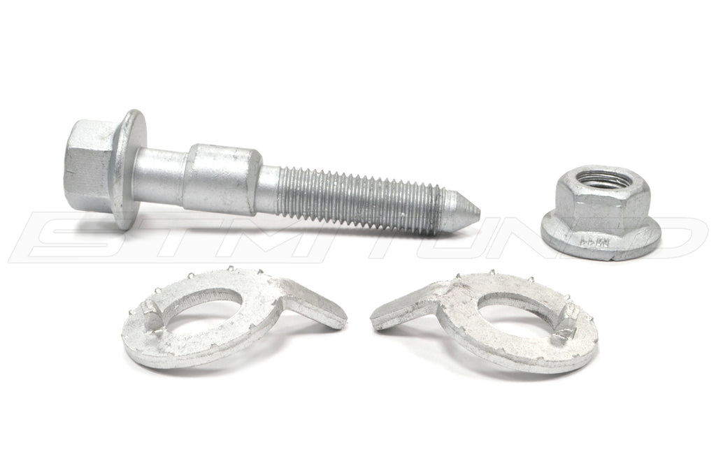 Powerflex Evo 7/8/9 front camber bolts allow up to +/- 1.75 degrees of adjustment. They replace the original upper bolt on struts with 2 bolt fixings, one above the other, between the strut and knuckle.