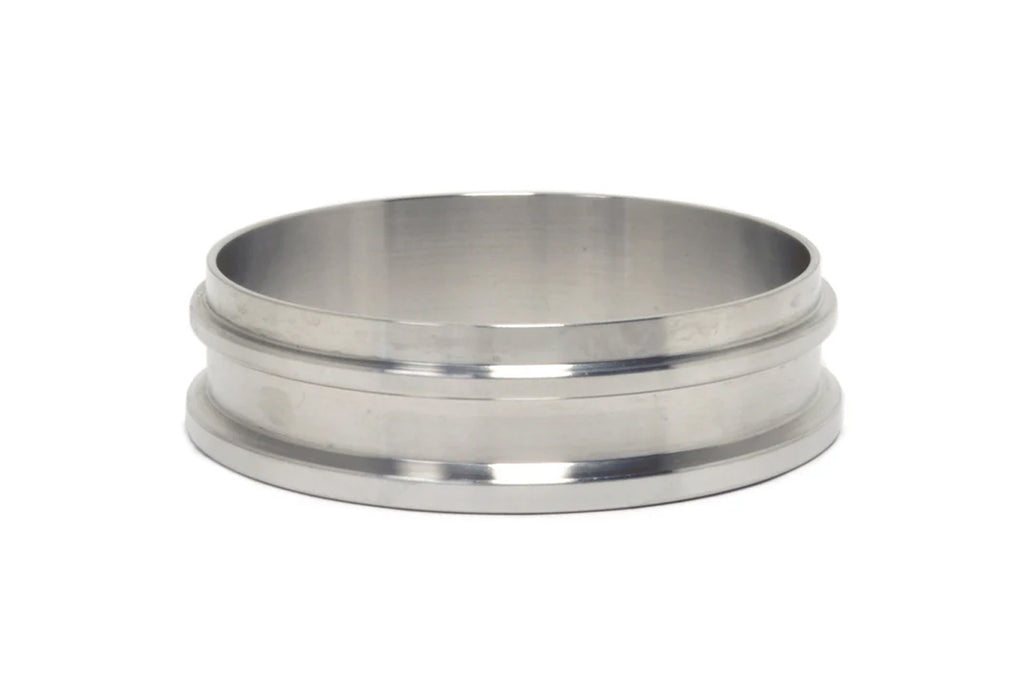 Precision Turbo & Engine stainless steel turbine housing outlet weld flange for PTE housings with a T3 4-bolt inlet and the T3 sized v-band outlet. For use with 3" stainless steel tube.