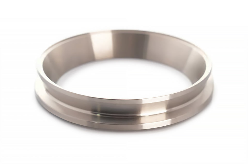 Precision Turbo & Engine stainless steel turbine housing outlet weld flange for PTE housings with the T4 sized v-band inlet and v-band outlet. For use with 4" stainless tube.