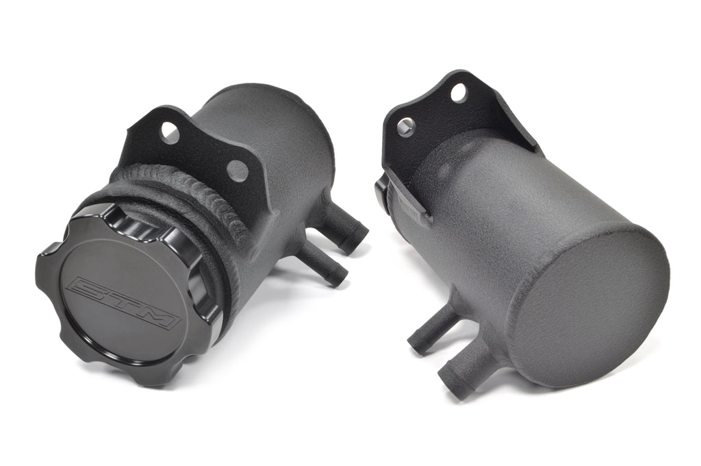 The STM Evo X aluminum power steering reservoir is a direct replacement for the factory piece. Available brushed, wrinkle or gloss black. Includes the 3" STM black cap, stainless hardware and hose clamps for a clean and simple install.