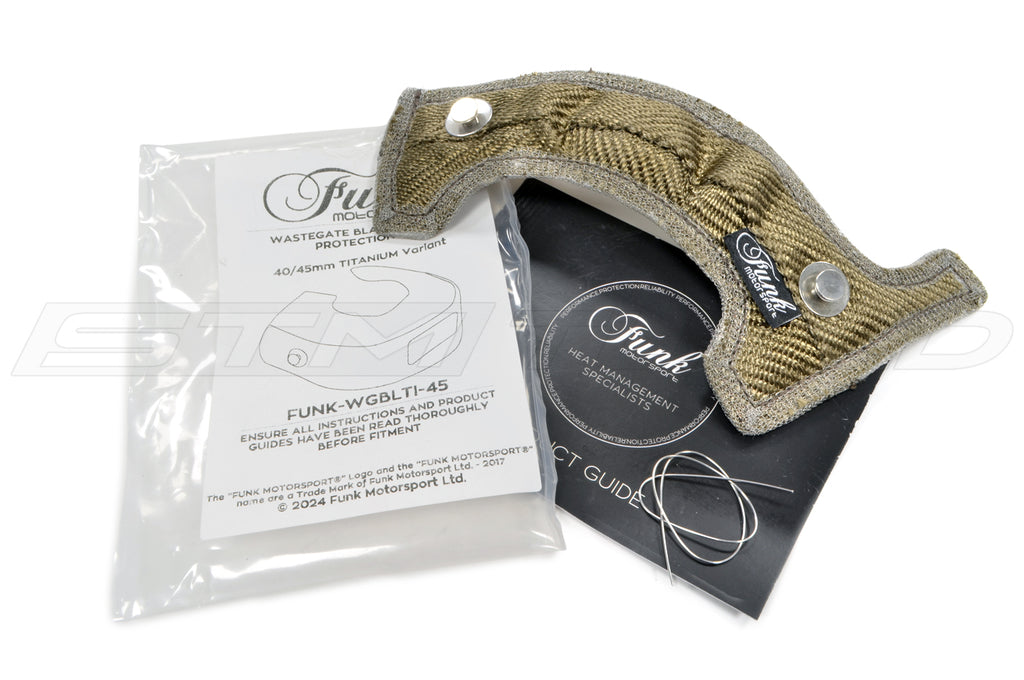 Funk Motorsport titanium heat blanket for 40-45mm external wastegates reduces surface temps up to 80% and helps protect the diaphragm from boost creep. Includes the blanket and install wire.
